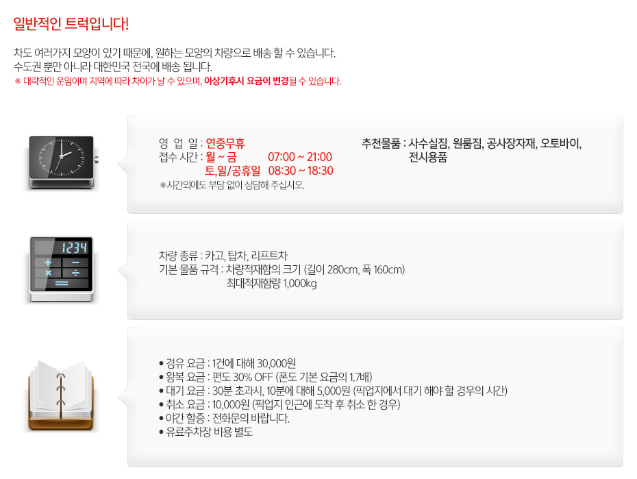 | 추천물품 | 사수실짐, 원룸짐, 공사장자재, 오토바이, 전시용품 |